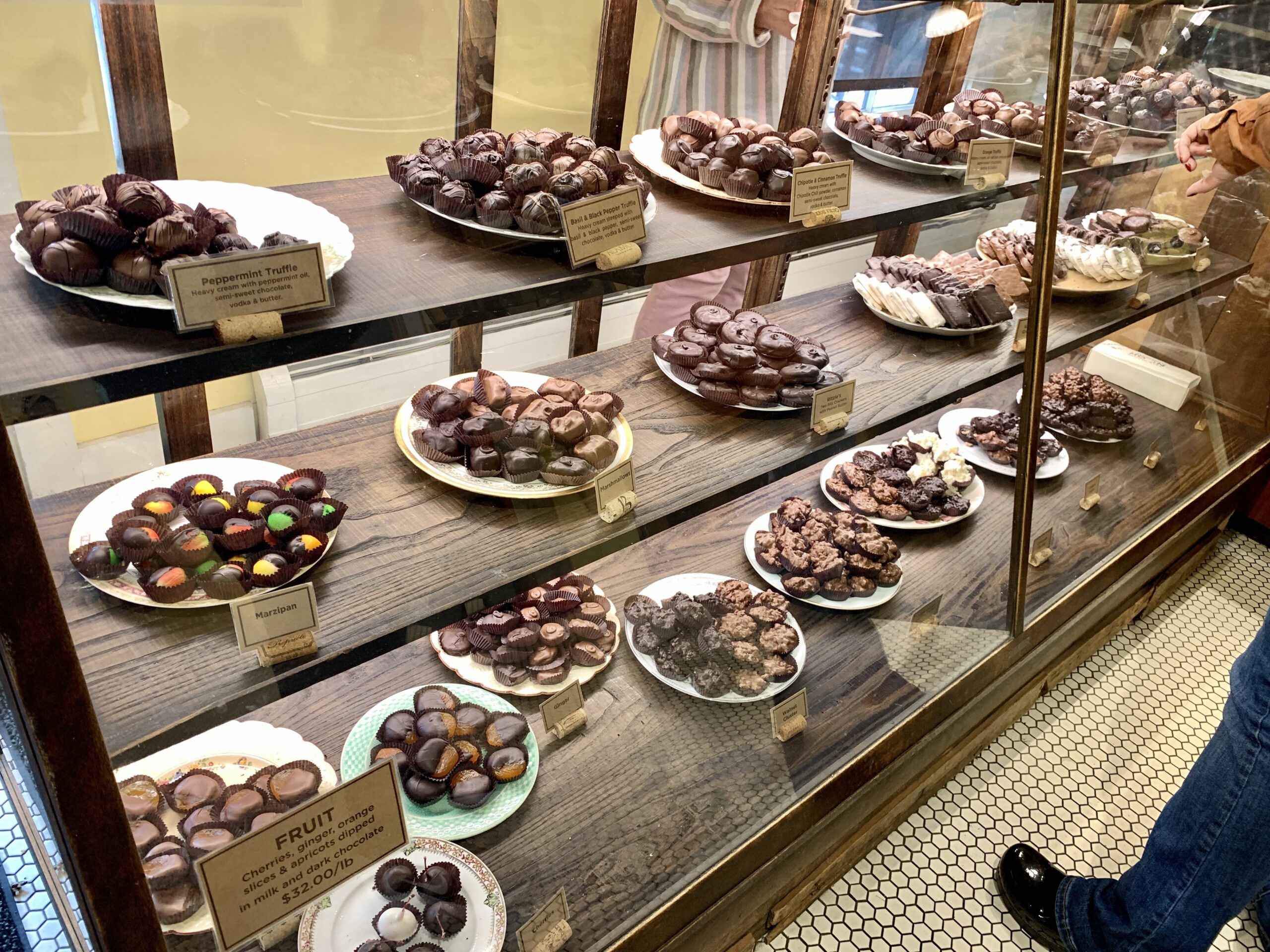 Case of chocolate truffles at Laughing Moon Chocolates Stowe Vermont